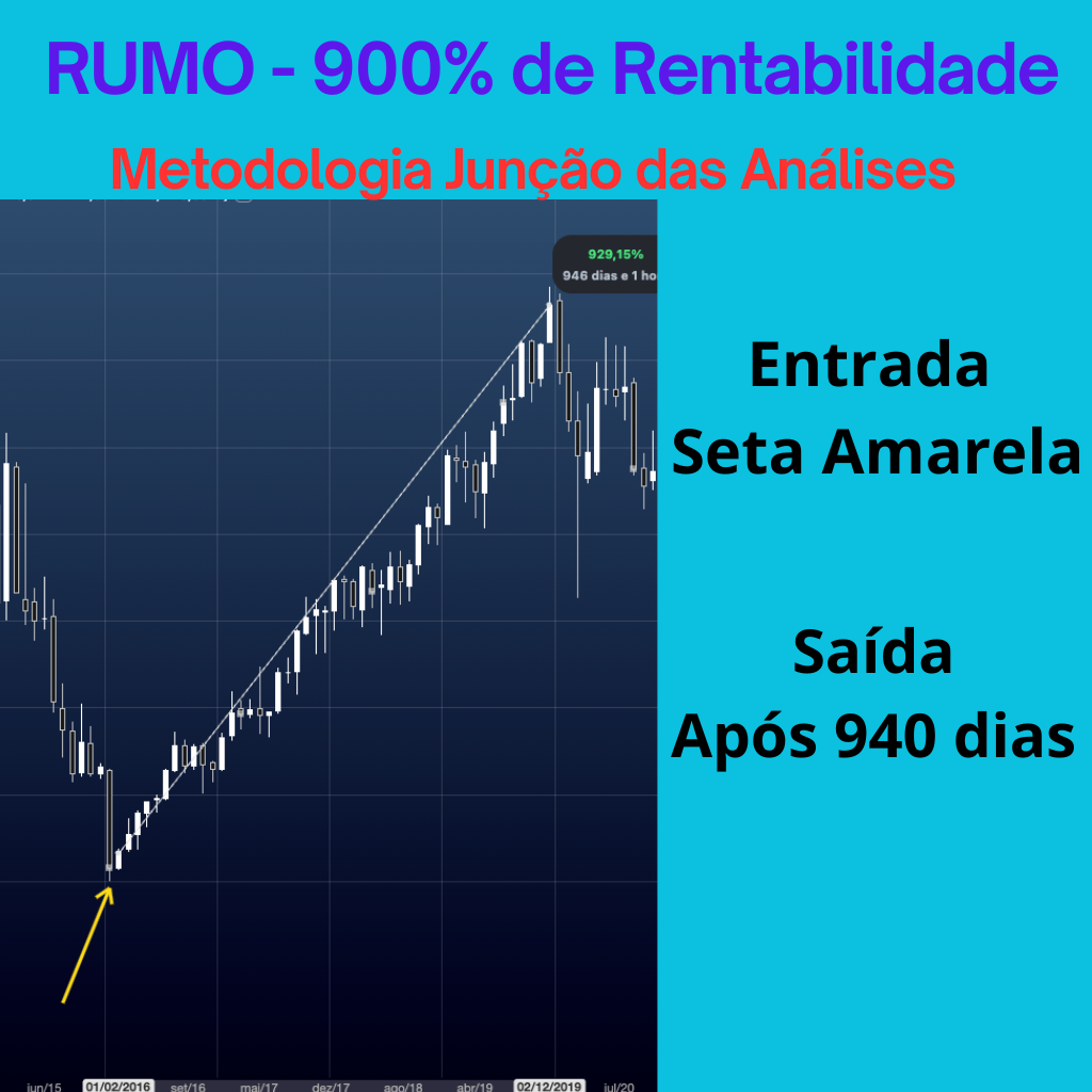 Como exemplo abaixo uma operação realizada em RAIL3 – RUMO usando a junção das análises e que gerou mais de 900% de lucro.